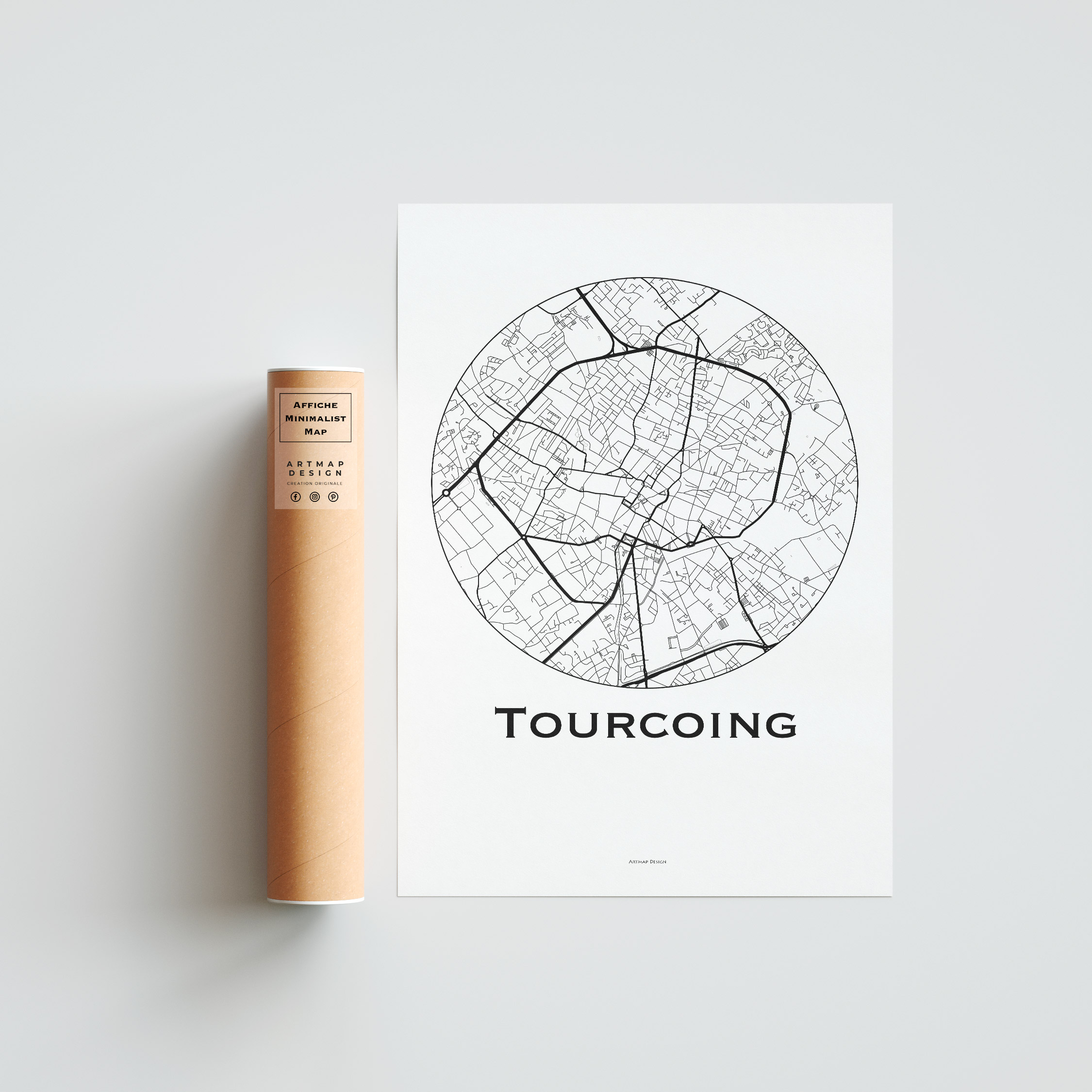 Cette carte est réalisée avec les rues de la ville. Ce sont les rues qui représentent la plus grande quantité de l’espace public dans une ville. Ces cartes modernes illustrent la beauté qui résulte de la construction de la ville. L’affiche Tourcoing Minimalist Map illustre la géographie et les motifs de cette ville.
