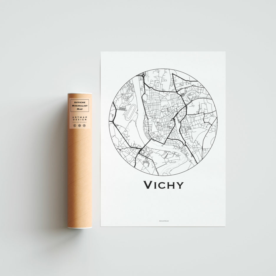 Cette carte est réalisée avec les rues de la ville. Ce sont les rues qui représentent la plus grande quantité de l’espace public dans une ville. Ces cartes modernes illustrent la beauté qui résulte de la construction de la ville. L’affiche Vichy Minimalist Map montre la géographie et les motifs de cette ville.