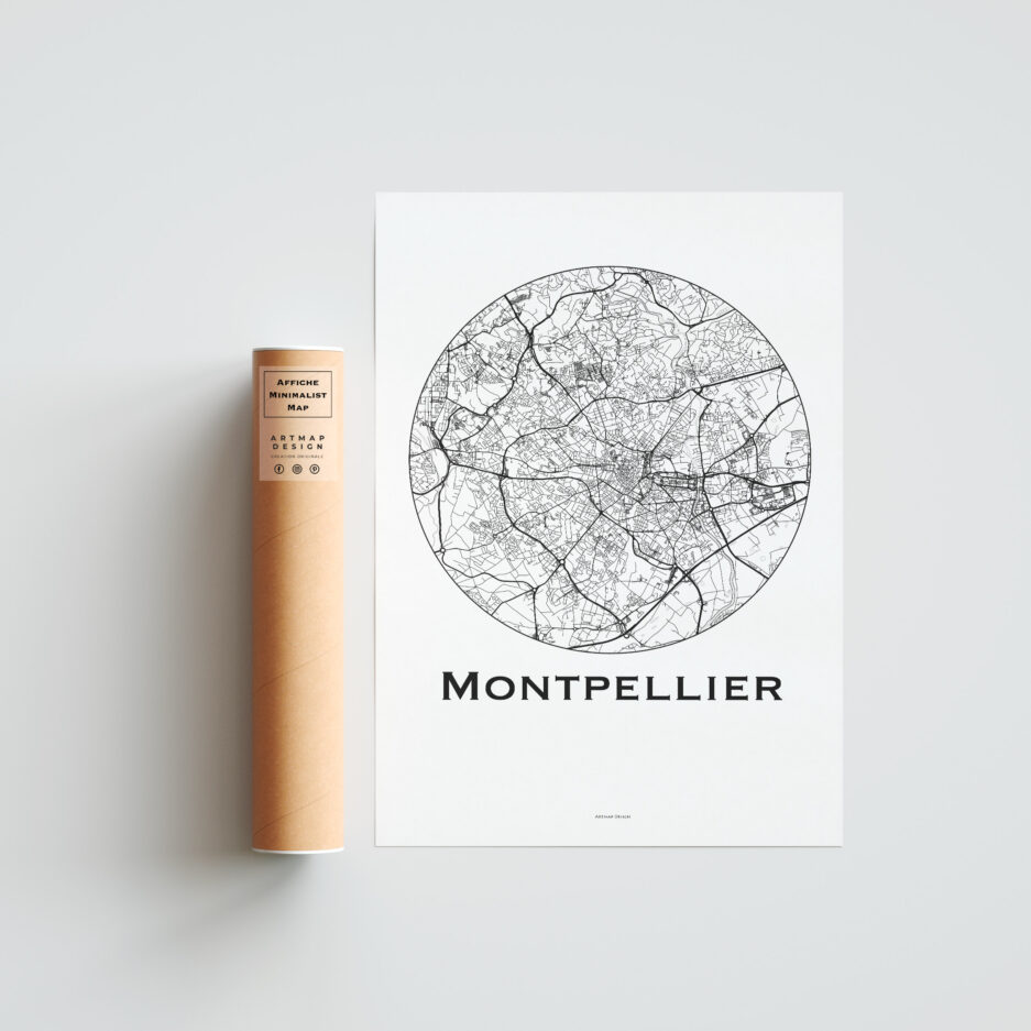 Cette carte est réalisée avec les rues de la ville. Ce sont les rues qui représentent la plus grande quantité de l’espace public dans une ville. Ces cartes modernes illustrent la beauté qui résulte de la construction de la ville. L’affiche Montpellier Minimalist Map illustre la géographie et les motifs de cette ville.