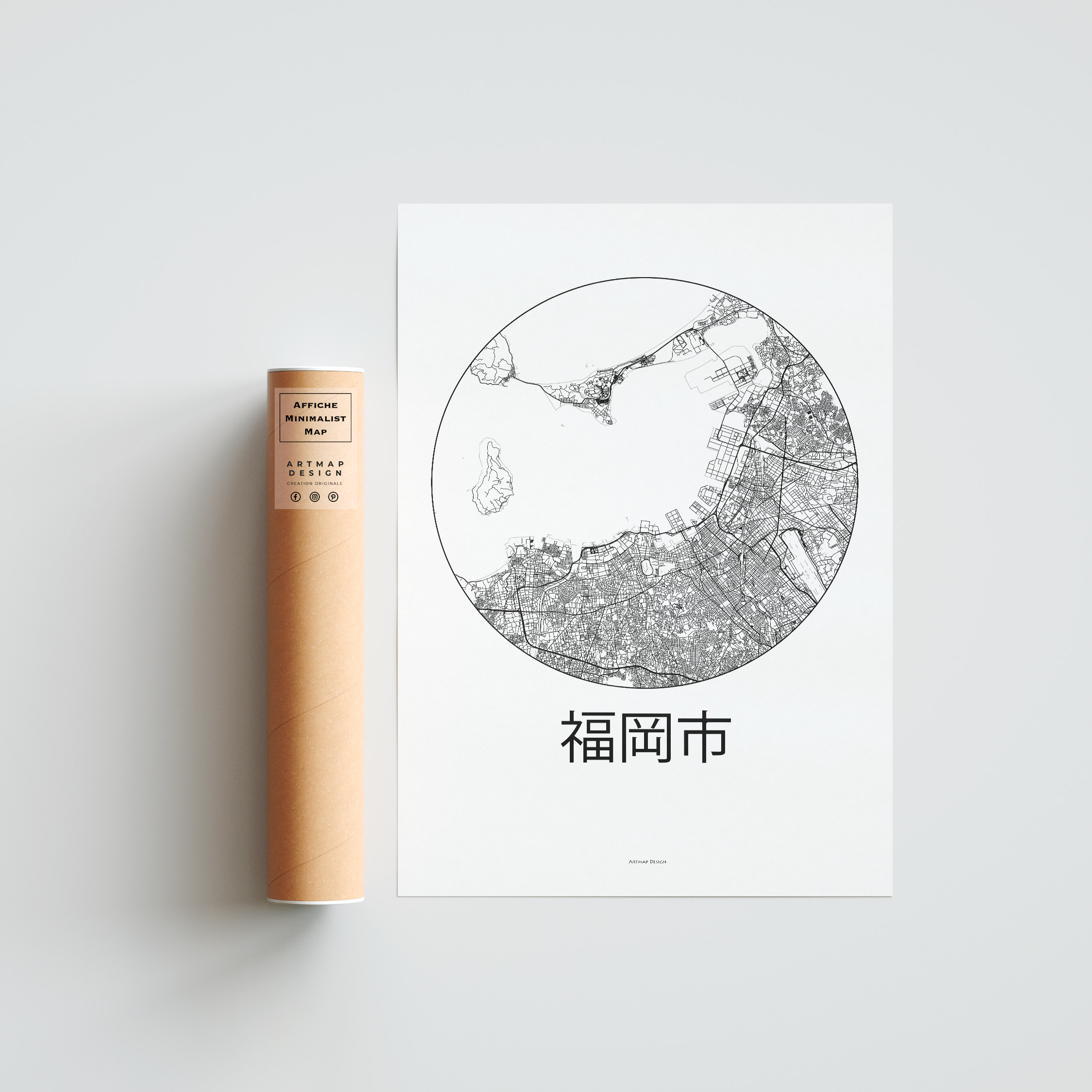 Cette carte est réalisée avec les rues de la ville. Ce sont les rues qui représentent la plus grande quantité de l’espace public dans une ville. Ces cartes modernes illustrent la beauté qui résulte de la construction de la ville. L’affiche Fukuoka Japon Map illustre la géographie et les motifs de cette ville.
